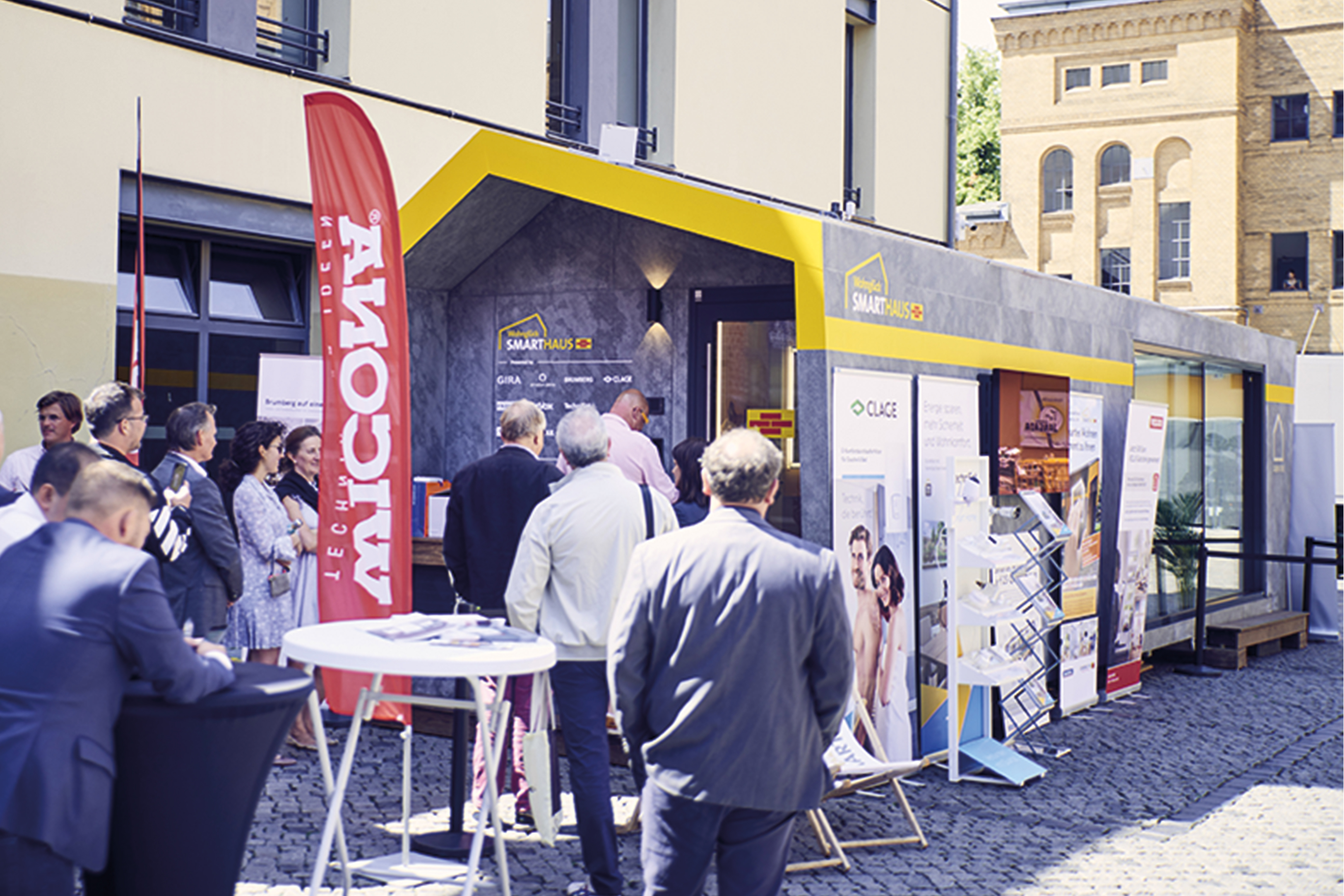 Das Smart-Haus ist ein funktional gestalteter Holzsystembau aus nachhaltigen Materialien mit Wohn- und Schlafbereich, Badezimmer und Küche. Trotz der geringen Fläche von nur 25 m² steckt jede Men-ge intelligente Technik im Smart-Haus. Insgesamt 20 Markenhersteller lieferten ihre Produkte für das Smart-Haus. Die verschiedenen Lösungen sind miteinander vernetzt und lassen sich zentral steuern. Besuchern wird so veranschaulicht, was mit smarter Technik für mehr Komfort, Sicherheit und Ener-gieeffizienz im eigenen Zuhause alles möglich ist.