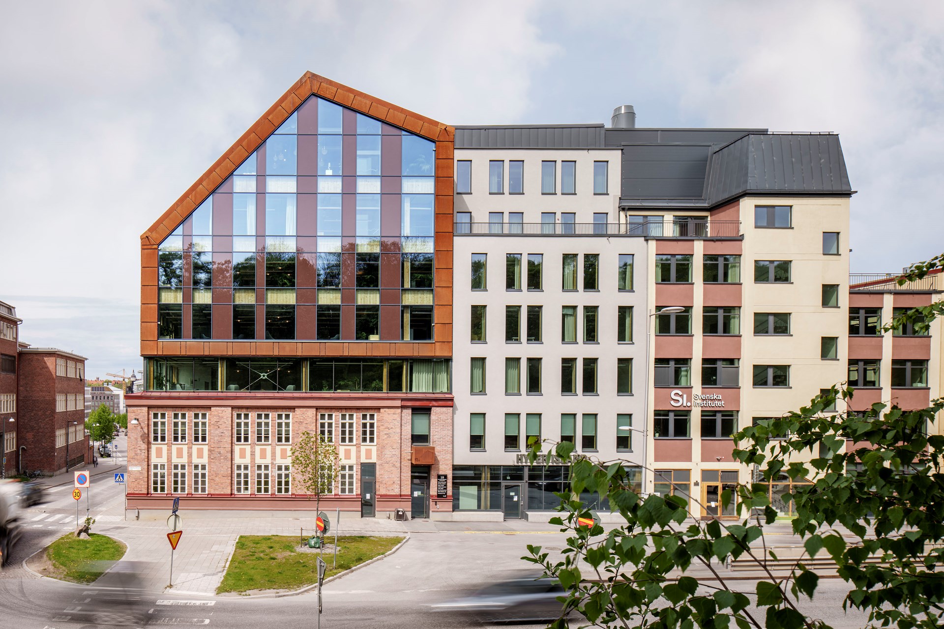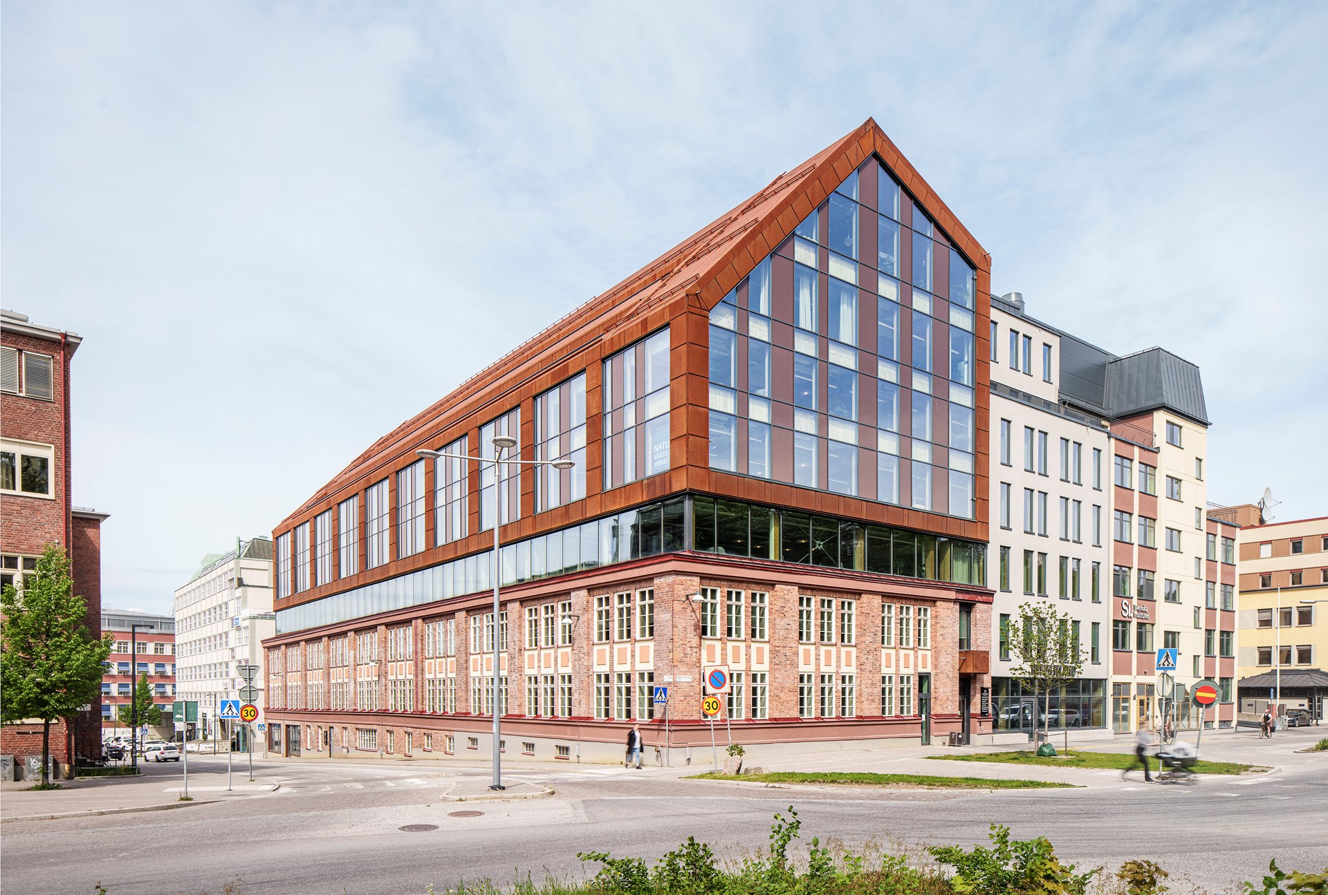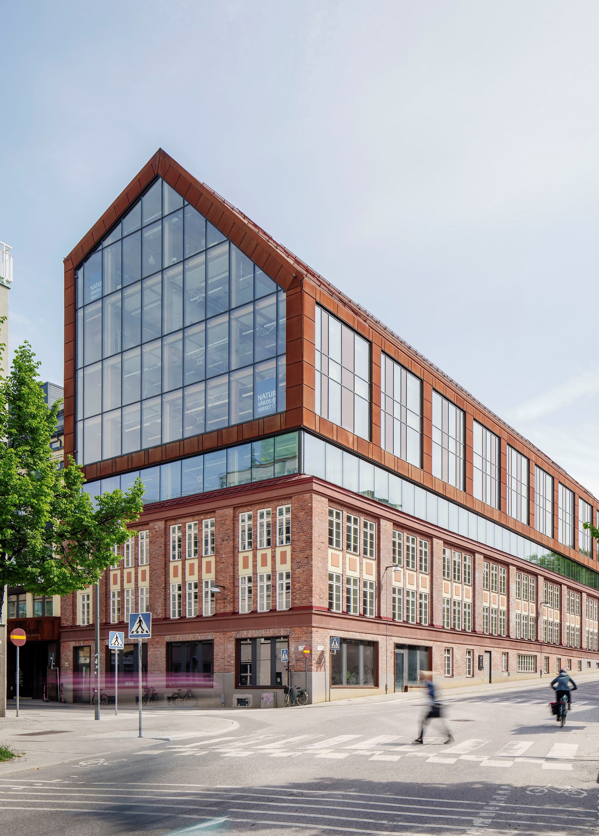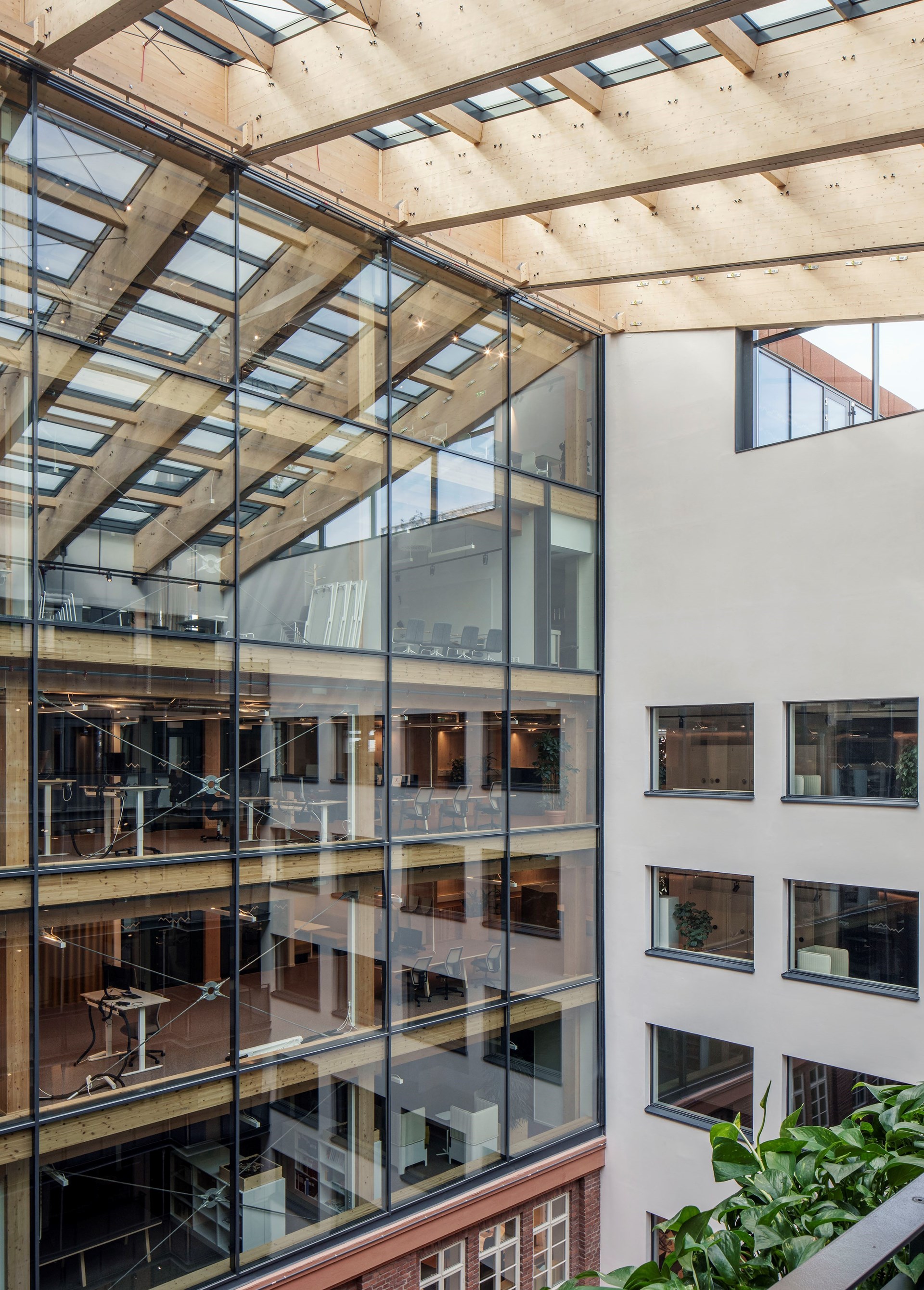 “The ambition where to have a transparent façade in the superstructure to the north, a big window that accentuate the contrast between the industrial metal sheet and the warmth of the internal wooden structure. The glass façade is unique and a close collaboration between the façade manufacturer and fire consultant where needed to reach the buildings fire safety requirements,” says Daniel De Soussa Barrera at Tengbom.