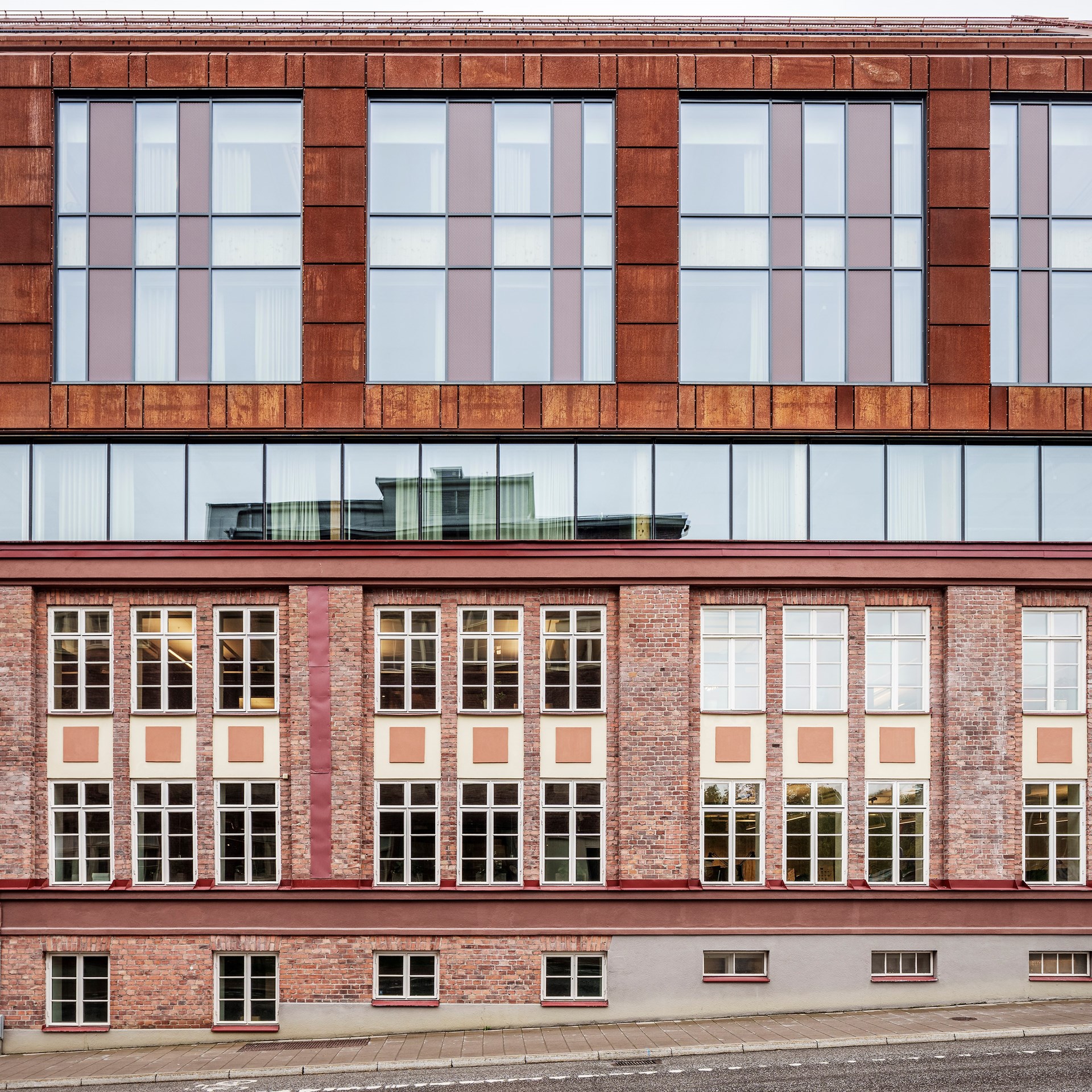Old brickwork and modern metal give Trikåfabriken a grand elegant design without compromising the new buildings characteristics with an evolution of the design. There’s a fine balance between conservation and development, but this project is a brilliant example of how old and new material integrate naturally and elegant.