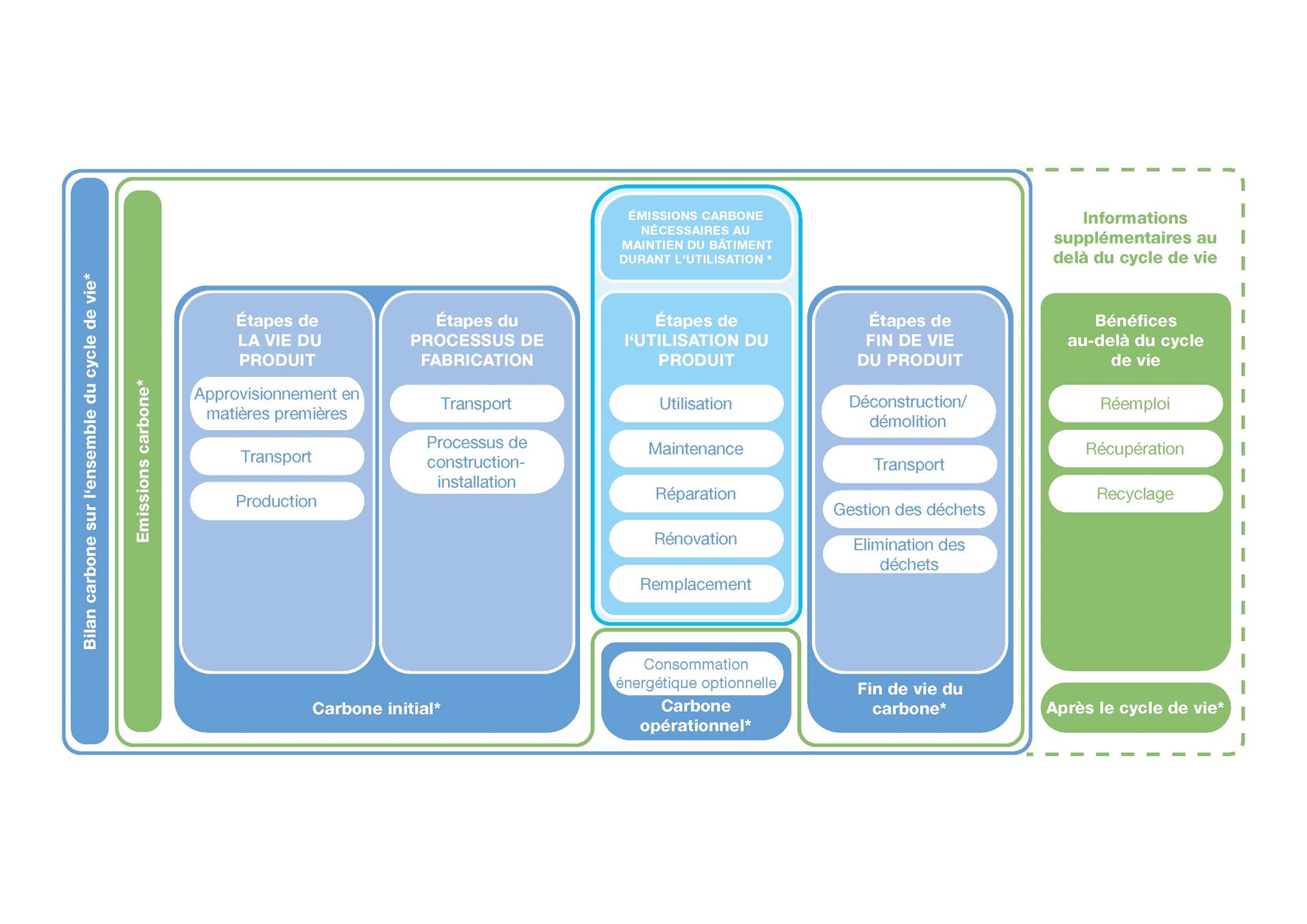 Le secteur du bâtiment et de la construction représente 39 % des émissions mondiales de carbone liées à l'énergie. L'empreinte carbone d'un bâtiment est subdivisée en deux étapes : l'exploitation (émissions liées à l' «utilisation» et causées par le chauffage, la climatisation, etc.) et la construction (émissions « initiales » issues de l'extraction et la production des matériaux, la livraison, la gestion des déchets, etc.). La phase d'exploitation représente 72 % de l'empreinte carbone totale du bâtiment, tandis que la construction et la production représentent 28 %.