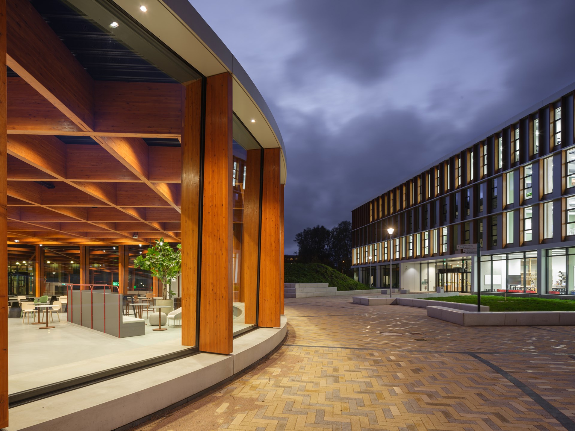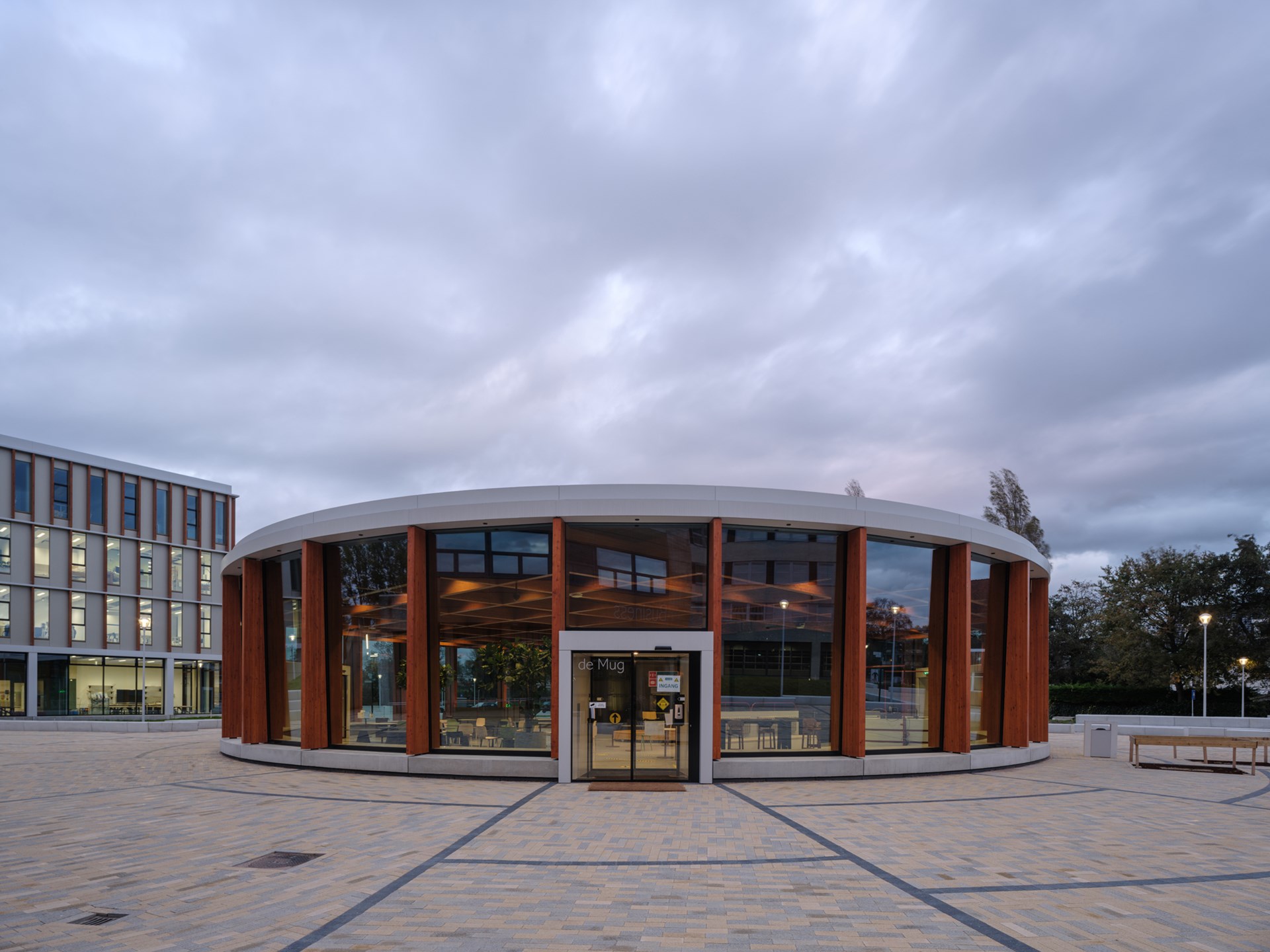 Le pavillon rond et multifonctionnel De Mug, situé au centre, est constitué d’une grande construction en bois qui confère au bâtiment une identité propre. Le toit vert assure l’isolation tout en garantissant au bâtiment une intégration harmonieuse au paysage vert du campus.