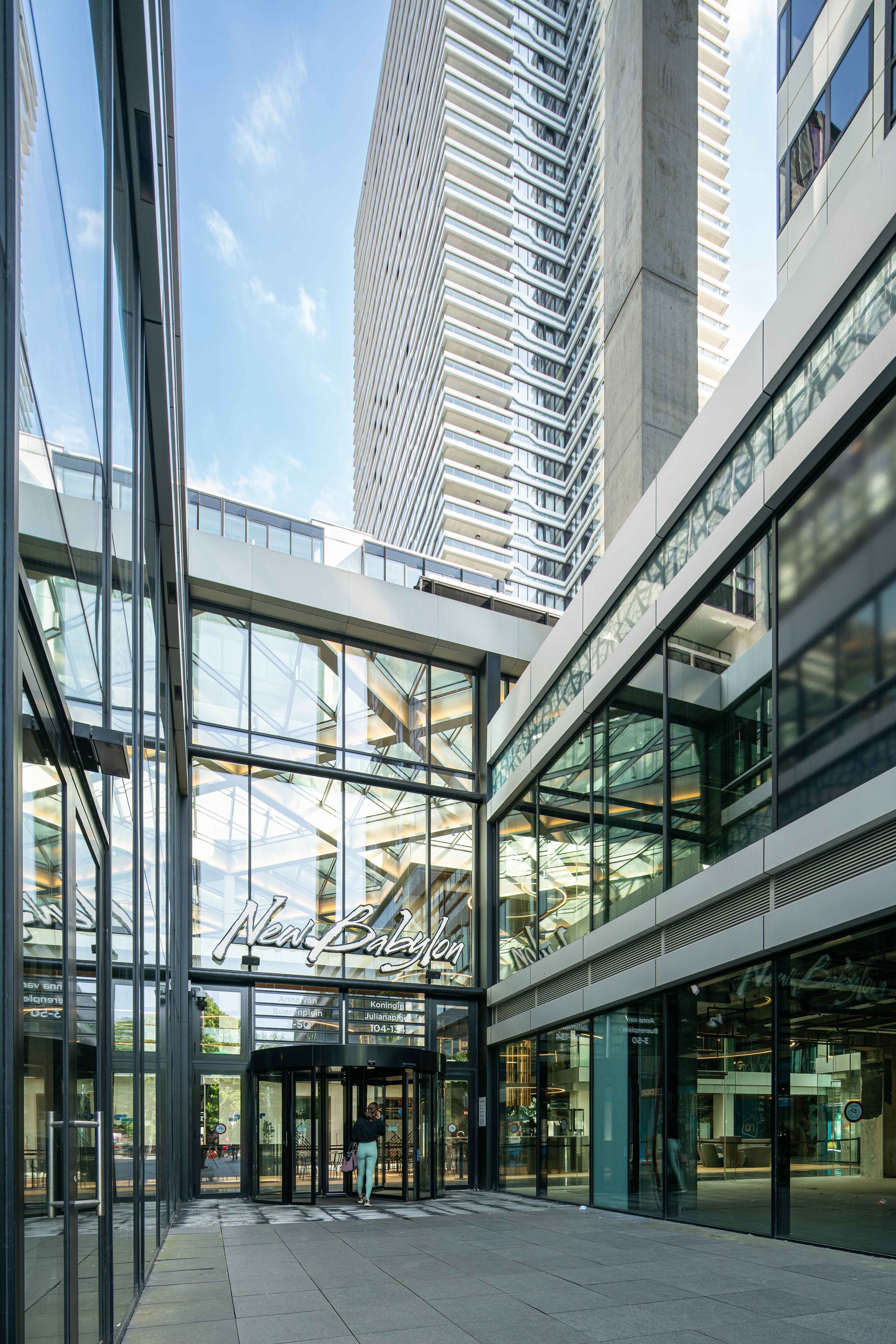 Le projet New Babylon comprend la rénovation et l’extension de l’ancien bâtiment Babylon, conçu d’après les plans de J. A. Lucas et W. T. Ellerman (1978). Entre 2007 et 2012, l’ancien complexe a été adapté aux exigences modernes, et sa superficie est passée de 44 500 m2 à pas moins de 145 000 m2. Le versant nord-ouest du bâtiment s’est vu annexer un volume composé d’espaces de bureaux et une tour résidentielle de 100 mètres de haut, tandis qu’une tour résidentielle culminant à 140 mètres a pris ses quartiers du côté sud-est. Le rez-de-chaussée et le premier étage abritent des espaces commerciaux, tandis que les étages suivants sont dédiés aux bureaux.