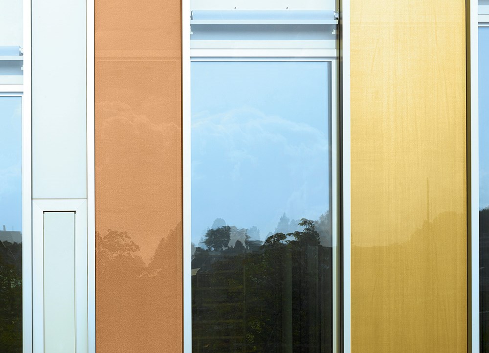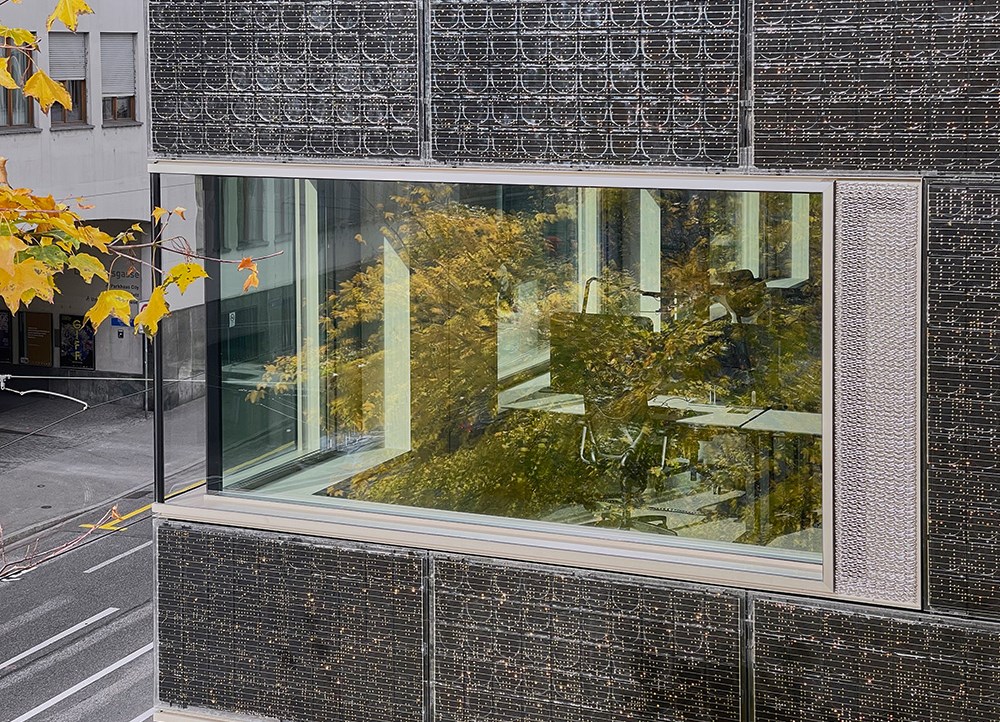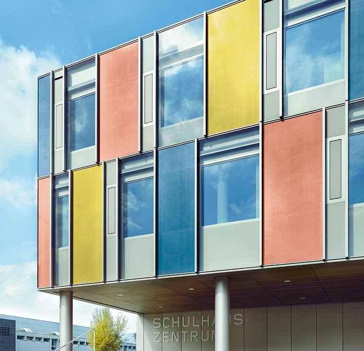 Une particularité visuelle de la façade du Schulhaus Zentrum de Horw réside dans ses éléments opaques vus de l’extérieur, mais transparents de l’intérieur. Ce résultat est obtenu grâce à un tissu spécial fabriqué par la société suisse Sefar AG (Heiden).