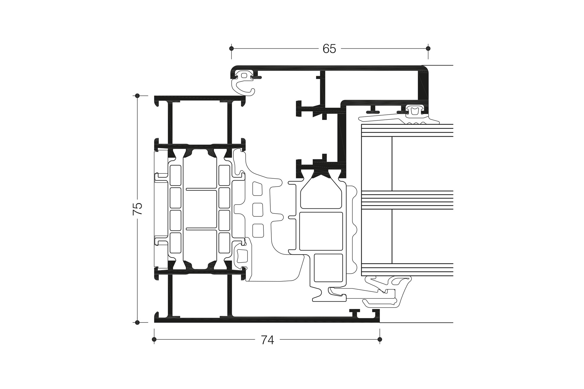 - Highly thermally insulated multi-chamber system with ETC Intelligence® thermal break zone, which implements window designs with only 75 mm frame depth to passive house standards.